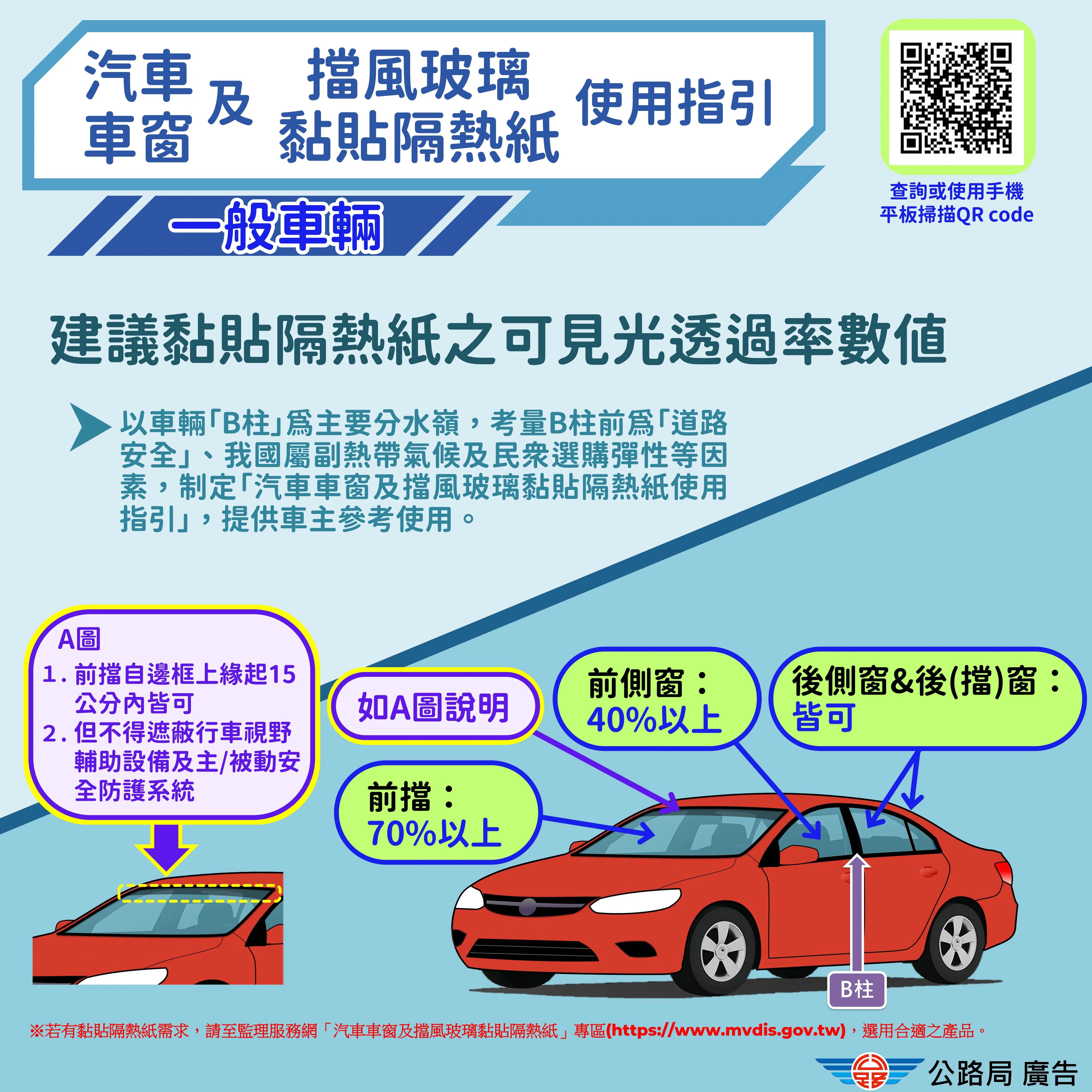 公路局提到,考量我國氣候環境、道路安全、國人用車習慣及價格可負擔性,並比較各國規範後,以車輛「B柱」為主要分水嶺,考量B柱前為「道路安全」、B柱後計程車屬汽車運輸業及民眾乘車安全,並考慮我國屬副熱帶氣候及民眾選購彈性等因素,本次指引建議車輛前擋黏貼可見光透過率70%以上、前側窗40%以上的隔熱紙;計程車後側窗及後(擋)窗黏貼均為40%以上的隔熱紙,以確保駕駛人在行駛過程中,具有足夠行車視線與清晰的視野,以維護駕駛人及行人的安全。